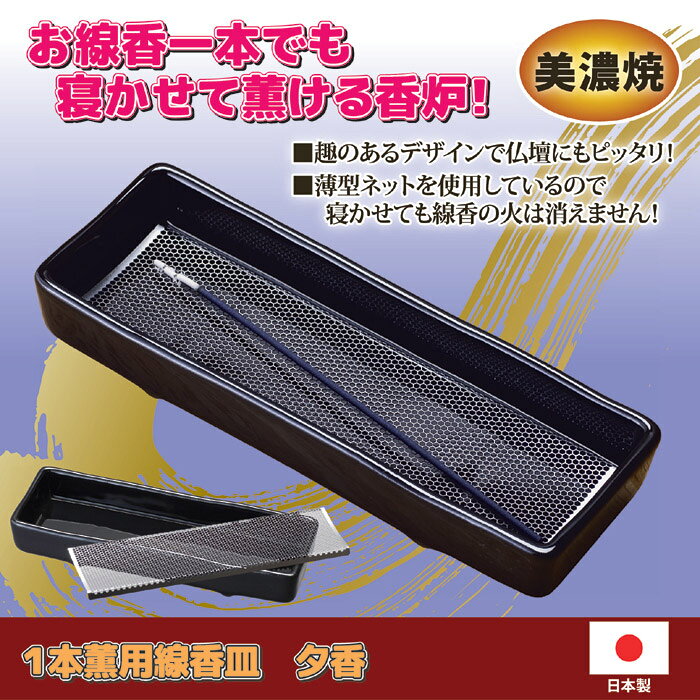 お線香一本でも寝かせて薫ける香炉!●お線香一本でも寝かせて薫ける香炉!●趣のあるデザインで仏壇にもピッタリ!●薄型ネットを使用しているので寝かせても線香の火は消えません!●お香を楽しむ時や、仏壇での線香立ての代わりとして人気の高い寝かせる線香皿です。